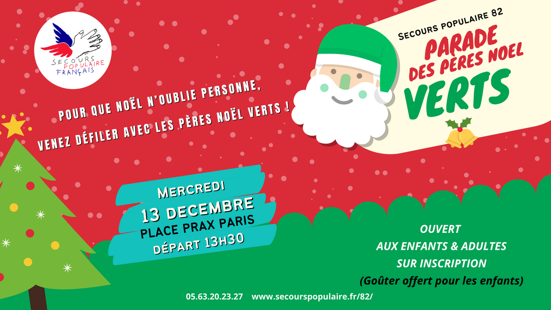 A Montauban, le mercredi 13 Décembre, Pères Noel Verts, enfants, familles et bénévoles feront une déambulation dans les rues du centre-ville. Cette parade sera accompagnée d'une collecte de rue pour que Noel n'oublie personne.
