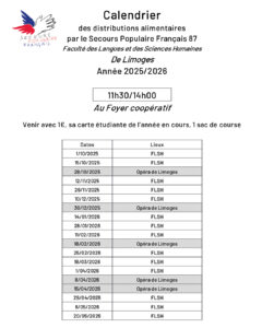 Les distributions se feront cette année tous les 15 jours (voir le calendrier ci dessous) pour des raisons logistiques et attention pour quelques dates elles se feront à l’Opéra de Limoges ! Elles se situent au Foyer coopératif à la Faculté de Lettres et des Sciences Humaines entre 11h30 et 14h !