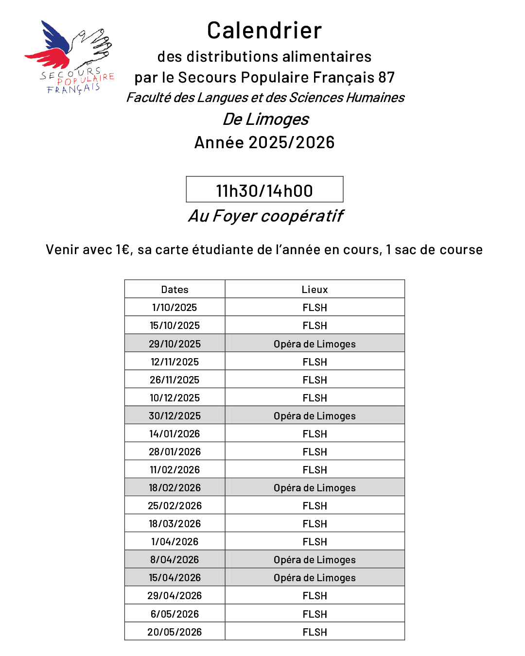 Les distributions se feront cette année tous les 15 jours (voir le calendrier ci dessous) pour des raisons logistiques et attention pour quelques dates elles se feront à l’Opéra de Limoges ! Elles se situent au Foyer coopératif à la Faculté de Lettres et des Sciences Humaines entre 11h30 et 14h !