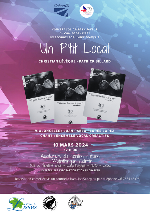 Ce concert est l’aboutissement d’une démarche initiée en 2023 par notre comité : les textes qui seront chantés (musique « Christian Lévèque) sont issus du recueil de poésie, « Voyant baisser le Jour » livre est édité au profit de notre Comité. L’auteur, Patrick Billard, ami de notre comité, en contrepartie des aides qu’il reçues nous a donné ses poèmes et … les droits qui vont avec ! L’illustratrice Christine Druesne a donné ses photos et dessins, le graphiste, John Vautier et l’éditeur (https://lechatalalucarne.fr/) ont travaillés bénévolement.