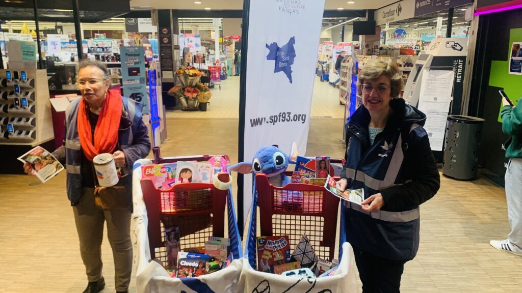 Dès 10 heures ce samedi 15 novembre, les bénévoles ont commencé à tracter et à solliciter les clients du Carrefour de Livry-Gargan pour les inviter à choisir des cadeaux à déposer à leur sortie dans les caddies du SPF. Lors de cette collecte, nous avons eu la belle surprise d’un client qui s’est fait accompagner par deux membres de l’équipe pour choisir elles-mêmes dans les rayons. A la caisse c’est un don de près de 180 euros que ce client a réglé directement. Au delà de ce don exceptionnel les clients de Carrefour ont été très généreux et nous avons ainsi rempli 5 caddies de jeux, jouets et livres neufs.