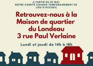 A partir du jeudi 22 mai à 14h, vous pourrez retrouver nos bénévoles les lundi et jeudi après-midi de 14h à 18h à la Maison de quartier du Londeau, 3 rue Paul Verlaine.