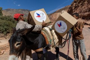 Douard Algou, Agadir, Maroc, le 15/09/2023. Distribution de panneaux photovoltaïque et de lampe pour éclairer des habitations dans un village.