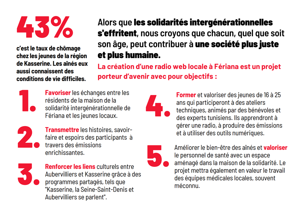 Ensemble, construisons une web radio qui fera dialoguer les générations et rapprochera les cœurs entre la Tunisie et la Seine-Saint-Denis.