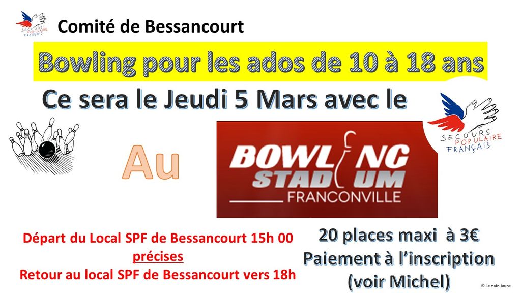 Jeudi 5 mars 2026, le Comité SPF de Bessancourt organise « la » compétition bowling des ados