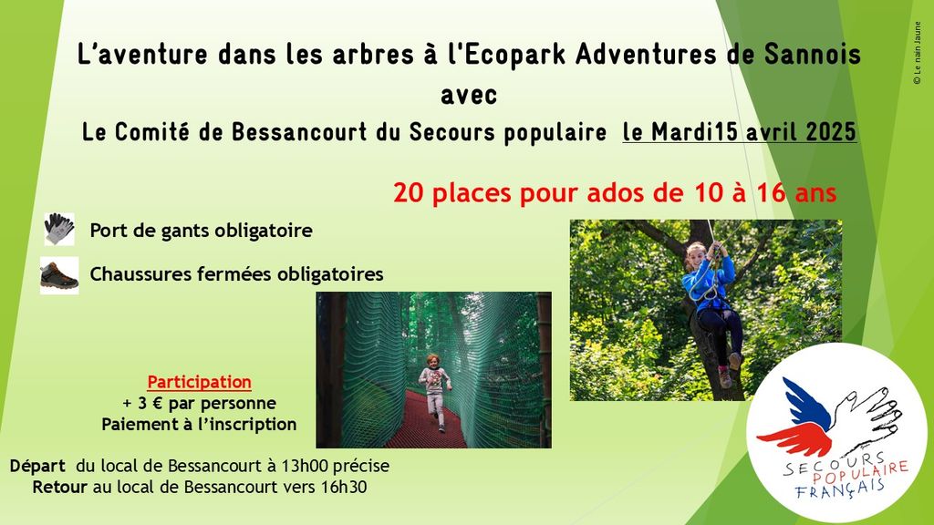 Durant les vacances de Pâques le Comité de Bessancourt du Secours populaire propose aux ados de 10 / 16 ans une sortie à l’Ecopark Adventures du Moulin de Sannois, pour une balade dans les arbres.