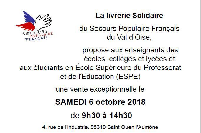 La livrerie Solidaire du Secours Populaire Français du Val d’Oise, propose aux enseignants des écoles, collèges et lycées et aux étudiants en École Supérieure du Professorat et de l’Education (ESPE) une vente exceptionnelle de livres et de matériels pédagogiques au 4 rue de l’industrie à Saint Ouen l’Aumône 95310, le :