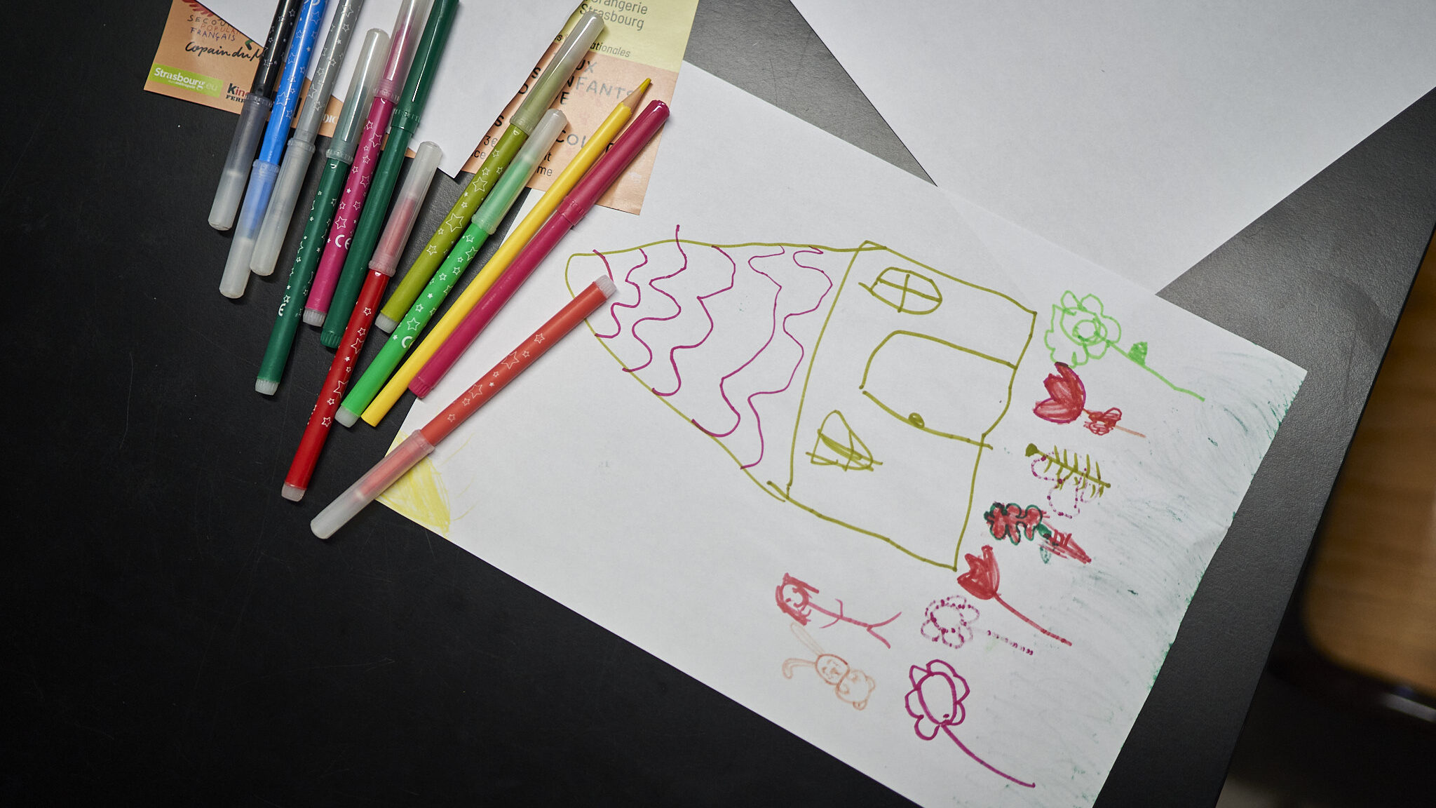 En fin de matinée, une quinzaine d’enfants se rendent dans une grande salle au premier étage. Ils s’asseyent tous en rond pour un atelier de sensibilisation à la santé. Iryna prend la parole : « Qui peut me dire ce qu’est la santé ? Vous avez déjà entendu ce mot ? » Quelques téméraires prennent la parole, mais globalement la salle reste silencieuse. « Et être malade, c’est comment ? » Là, les réponses fusent : « Tu as le nez qui coule ! » ; « Tu peux pas te lever ! » ; « T’as mal à la tête ! » ; « Tu manques l’école ! » Iryna écoute, relance et résume les interventions. Elle propose ensuite que chacun dessine ce que c’est pour lui ou elle ce que peut être la santé. Jabil, 10 ans, dessine un bonhomme qui marche. Le chemin serpente jusqu’à… une maison.