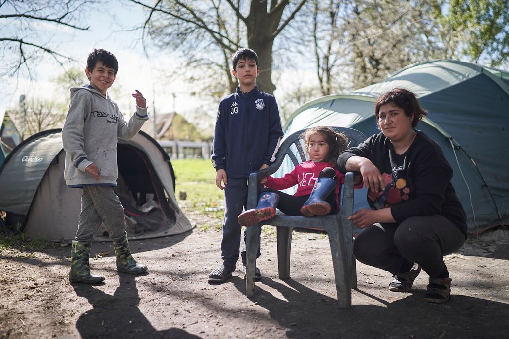 Un peu plus loin, quatre garçons et une fille jouent. Ils courent. Rigolent. Tout autour, les adultes présents sont dans leur tente ou sous les auvents de toile qui servent de coin cuisine. L’un des garçons, Nikolazi, joue gaiement ; on ne pourrait pas deviner que la nuit précédente il a été pris d’une violente crise de fièvre. Sa mère, Natia, s’inquiétait de savoir si cela pouvait avoir un lien avec le fait qu’il se soit brûlé le pied droit une semaine avant. Le garçon se dirige vers ses parents et une autre famille qui s’abritent dans une même tente. Il s’arrête juste en face, sous l’auvent où deux enjoliveurs l’un sur l’autre servent de brasero, qui est éteint. « C’est là que je me suis brûlé. En agrippant une casserole en train de chauffer, je me suis renversé de l’eau chaude sur moi », raconte le garçon, dans un français hésitant, grimaçant au souvenir de ce mauvais moment. Ses parents se sont dépêchés de l’emmener à l’hôpital immédiatement après.