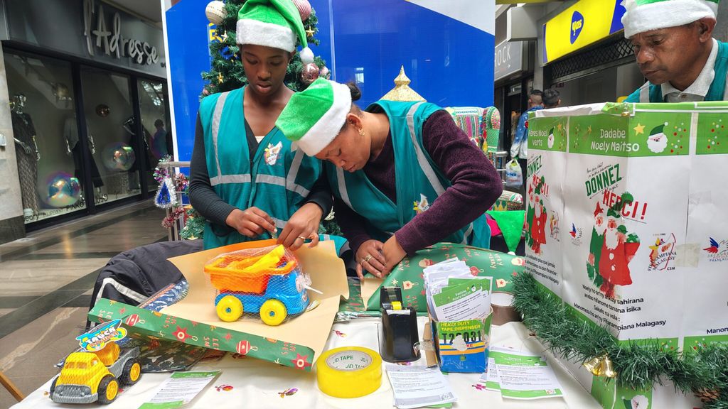 La campagne des Pères Noël verts commence ici comme en France par un temps essentiel : la collecte, afin de financer les moyens de la solidarité à venir. Ainsi du vendredi 19 au mardi 24 décembre, au centre commercial de La City Ivandry à Antananarivo (fréquenté par une clientèle relativement aisée), les bénévoles du Fifanampiana Malagasy se relaient sur le stand au pied du sapin. À l’entrée des magasins, ils accueillent les clients avec le sourire et appellent à la solidarité. En échange d’un don, ils emballent les cadeaux, recueillent des produits alimentaires et des jouets. Autour d’un stand bien décoré, les discussions s’engagent. Les bénévoles expliquent l’action de l’association, parlent des enfants accompagnés, racontent le quotidien des familles soutenues tout au long de l’année. Beaucoup de clients découvrent ainsi l’action du Fifanampiana Malagasy et du partenariat avec le Secours populaire. La solidarité se tisse au fil des rencontres. « C’est un moment important parce que cela permet de collecter un peu d’argent pour les gens dans le besoin, des familles défavorisées des quartiers très pauvres d’Antananarivo, et surtout pour la visibilité de l’association. Pendant cette période de l’année, le peuple malgache fait vivre le fihavanana [culture de l’entraide et de la solidarité] : c’est plus facile de collecter », explique Ferdinand, bénévole depuis 15 ans dans l’association.