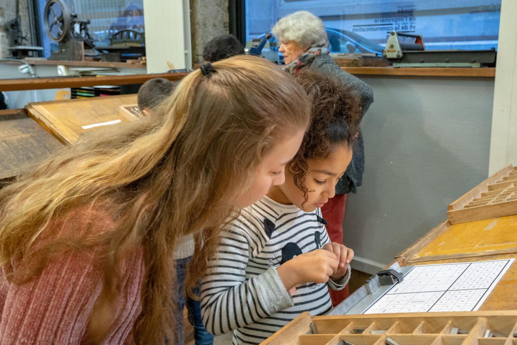 Retour au rez-de-chaussée, le petit groupe pousse la lourde porte ornée de ferronnerie de l’atelier d’imprimerie. Il est accueilli par Fernande, médiatrice culturelle. Au programme, composer un texte avec des petits caractères en plomb, comme le faisaient les imprimeurs du début du XXe siècle. Chaque enfant s’applique, assis devant des grandes casses en bois. A leurs côtés, Pauline et Danielle, deux ex-enseignantes qui participent à l’accompagnement scolaire. « C’est un échange, nous sommes souvent invitées à dîner. On discute beaucoup. Des liens se nouent avec la famille. Chut, c’est un secret ! », s’amusent-elles.