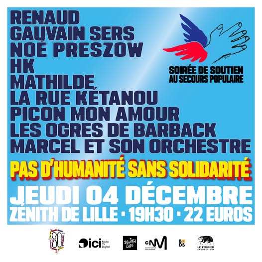 Pour fêter ses 80 ans, la fédération du nord du Secours Populaire organise un grand concert solidaire le jeudi 04 décembre 2025 à 19h30 au Zénith de Lille, en partenariat avec la radio ICI Nord (ex-France Bleue Nord).
