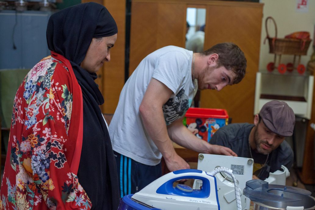 Ce jour là Salima est venue avec un fer à repasser qui ne fonctionne plus. Gentiment et avec beaucoup de patience, Alban lui explique les premiers gestes à faire quand un fer à repasser ne chauffe plus. Après quelques manipulations, le diagnostic est posé. Le fer est entartré. Pour régler ce problème Salima devra mettre du vinaigre blanc dans le réservoir, une fois rentrée chez elle. Et si jamais cela ne suffisait pas, il lui propose de revenir. Car le mot d’ordre des bénévoles, c’est de ne rien jeter. C’est ainsi que tous les tableaux qui sont donnés au Secours populaire sont démontés, les cadres revendus à la boutique solidaire et tous les canevas recyclés en sacs de plage par une bénévole, ancienne couturière.