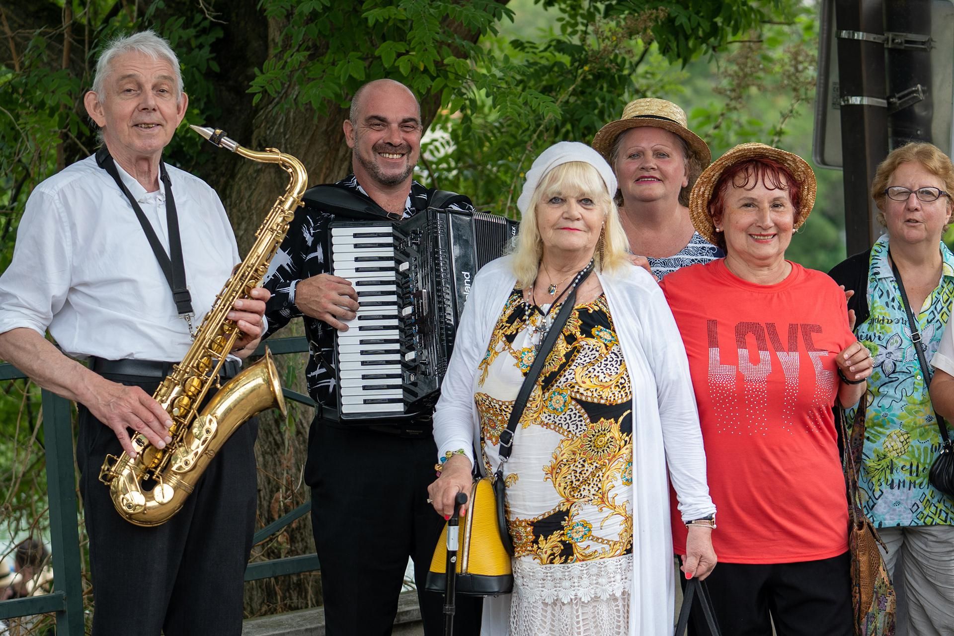 Canotiers sur la tête, les 400 retraités débarquent Chez Gégène vers 12 h 30. Ils sont accueillis en chanson par Dominique, saxophoniste et Pascal, chanteur et accordéoniste. « On est de vrais stars », rigole Joséphine, bénévole, du Comité de La Courneuve (Seine-Saint-Denis).