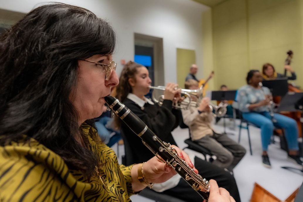 Tous trois montent la majestueuse volée de marches en pierre taillée du Conservatoire de musique. Ils s’orientent facilement dans le dédale des couloirs du grand bâtiment, passent devant des portes fermées d’où filtrent des bribes de musique et parviennent à la salle B2-03. Ils s’installent parmi les autres musiciens, se mêlent au petit orchestre bigarré : trois bassonistes, deux guitaristes, trois clarinettistes, deux pianistes, trois trompettistes, un percussionniste et une contrebassiste s’installent joyeusement. Samuel, leur professeur, crée une atmosphère détendue, pince-sans-rire et néanmoins concentrée. « Le premier jour de répétition, j’ai tout de suite reconnu Samuel, se souvient Teuta. Le Secours populaire nous avait emmenés à Lyon, pour aller voir un concert à l’Opéra. Samuel, c’était le chef d’orchestre. C’était la première fois de ma vie que j’allais voir un concert. C’était extraordinaire. » Plutôt que la justesse d’une note, c’est l’expressivité d’un son qui est poursuivie par Samuel – les autres musiciens, comme Teuta et ses enfants, viennent de découvrir leur instrument et ne savent pas lire la musique. Ce que leur professeur les invite à faire, c’est de transmettre des émotions à travers leur instrument, de parvenir à exprimer la tristesse, la joie, l’inquiétude ou encore l’espoir. Tout en écoutant les autres musiciens, dialoguant avec eux.