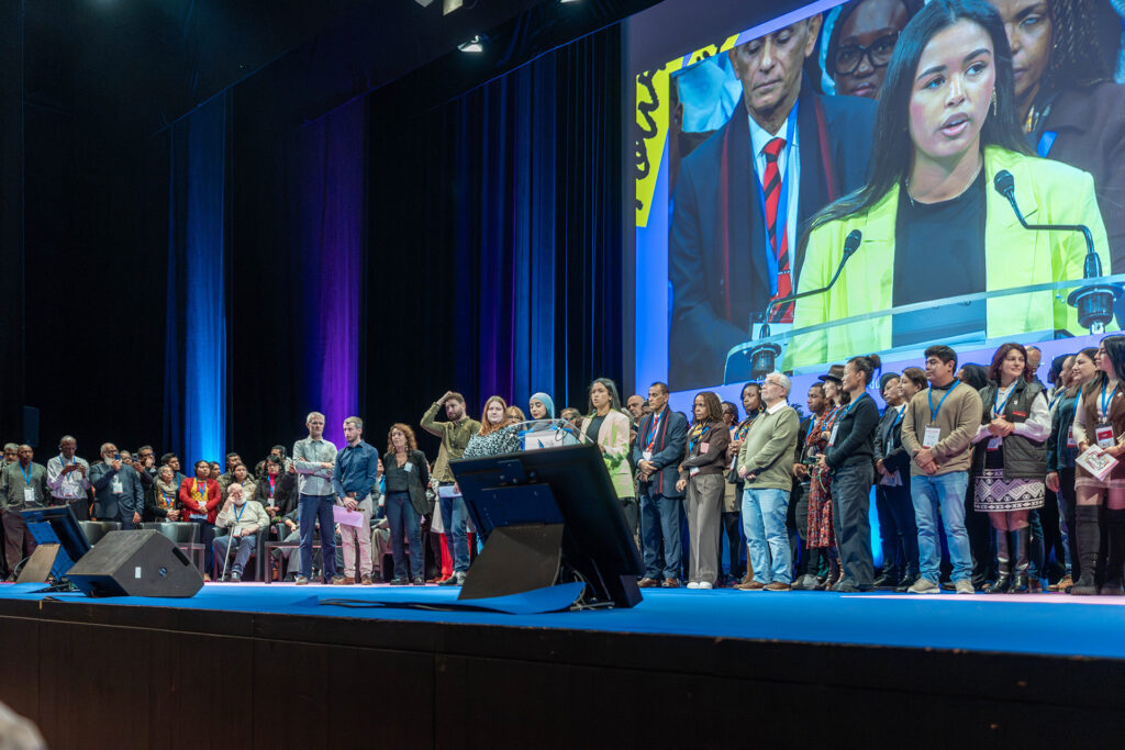 A la tribune montent trois jeunes femmes bénévoles de la région – trois figures d’engagement, héritières de ces luttes. Océane, de ses mots élémentaires et puissants, fait chavirer l’assemblée. Étudiante, elle connut la pauvreté, et c’est ainsi qu’elle rencontra le Secours populaire. Elle raconte la porte si difficile à pousser, la chaleur de l’accueil qui chasse la honte, la confiance qui revient. « Si c’est important d’être diplômée, c’est tout aussi important de manger à sa faim », conclut-elle. Hedil, lycéenne, appelle à l’engagement ; Neïla, du comité de Roubaix, célèbre la diversité des bénévoles qui constituent une « mosaïque humaine ». Telle mosaïque est sur scène : les 130 partenaires sont là, représentant 57 pays et une centaine d’associations qui « soulagent la souffrance de leur peuple », souligne Corinne Makowski, secrétaire nationale. Et de rappeler que « certains agissent au péril de leur vie ». En haut des gradins, au sein de sa délégation de la Creuse, Lucille Périot, secrétaire générale de la fédération, confie : « Je suis impressionnée par le nombre et la diversité de nos partenaires. La Palestine et l’Ukraine sont parmi les plus gros conflits mondiaux, c’est bouleversant de les avoir à nos côtés ». Côte à côte : c’est ainsi que le Secours populaire et ses partenaires cheminent, construisant un monde respectueux des droits humains.