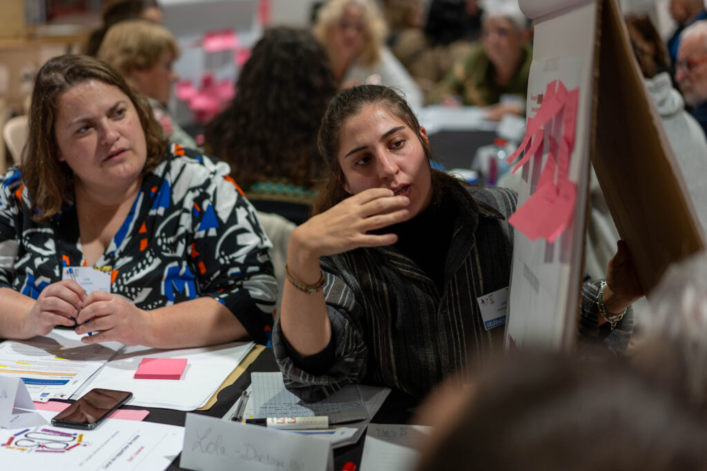 Chaque table octogonale – telle la cellule d’une ruche abeillère – semble une représentation miniature du Secours populaire dans sa diversité. Dirigeants aguerris et nouveaux bénévoles s’y côtoient ; des enfants, des jeunes, des partenaires internationaux y siègent. La solidarité est l’espéranto qui permet de dialoguer par-delà les générations et les cultures pour construire un monde commun – le monde plus juste, plus solidaire de demain. Une des tables est animée par Lellya et Élisa, bénévoles à Ajaccio. La seconde, 12 ans, prend note pour le rapport final ; la première, 15 ans, anime les débats. La plupart des présents à la table ont quatre, cinq fois leur âge mais cela n’a aucune incidence. Un immense respect règne – et beaucoup de tendresse, assurément. « Je suis fière de la place qu’ont pris les enfants bénévoles “Copain du Monde”. C’est la première fois que les enfants sont des délégués à part entière : pour cela, ce Congrès fera date ! », se réjouit Alice Meunier, membre du Comité départemental du Val-de-Marne et du Comité national.