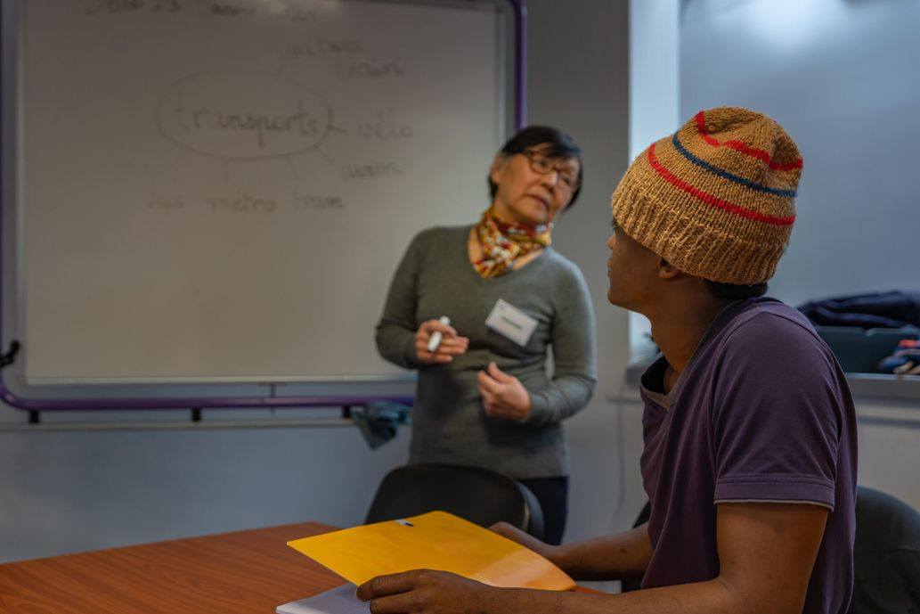Venus d’Albanie, de Guinée, d’Afghanistan, d’Égypte, d’Angola, etc., les jeunes étaient réunis au siège, avant le confinement, pour assister aux cours très vivants de Blandine, une directrice d’école à la retraite. Généralement, elle se tenait dos au tableau, au milieu des tables disposées en demi-cercle et, pour captiver l’attention de sa trentaine d’élèves, elle chorégraphiait ses cours de français, faisant de grands gestes devant ses élèves, généralement très attentifs. « Ils sont si enthousiastes, relève John, qui intervient de manière très bienveillante comme professeur assistant. Je suis toujours émerveillé. »