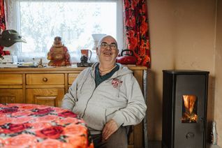 Didier, qui montre son poêle à bois