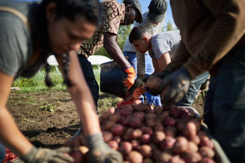 A côté d’un sillon de courges, bien rondes et gorgées de soleil, les plants de patates du jardin solidaire du Secours populaire du Puy-de-Dôme sont prêts à être récoltés. Kasandra et Nelson se penchent et ramassent les tubercules ramenés de leur continent par Parmentier, en compagnie de bénévoles, de personnes aidées et de Maxime, l’ingénieur agronome qui est un peu l’architecte de ce carré de verdure créé il y a quelques années pour alimenter en fruits et légumes frais les libres-services alimentaires de l’association.