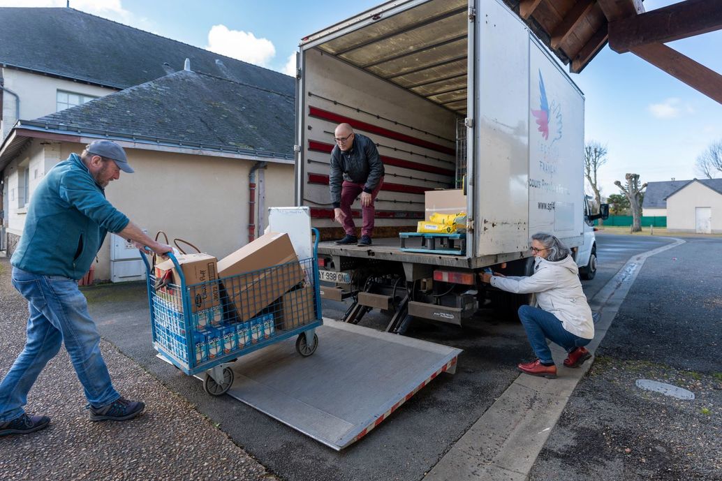 A la centrale de collectage du Secours populaire à Angers, située derrière l’enseigne Carrefour du quartier Saint-Serge le long de la Maine, Lucas, retraité, charge dans la bonne humeur le camion en partance dans le Beaugeois, au côté de Guy et Régine. Pour se rendre à Longué, il faut suivre la départementale, en regardant défiler les toits en ardoise pendant 40 minutes, traverser des hameaux entourés par les serres des pépinières. En tout et pour tout, l’équipe dépasse un petit garage, une pompe à essence, un restaurant en bord de route et un supermarché. A l’entrée de Longué, le camion tourne après l’usine du suédois Assa Abloy, dont les 250 salariés produisent des poignées et des butées de portes. Puis, en passant devant l’école maternelle Victor Hugo, construite à la fin des années 1930, Guy oblique sur la droite.