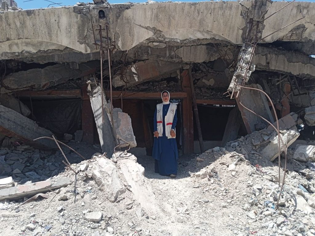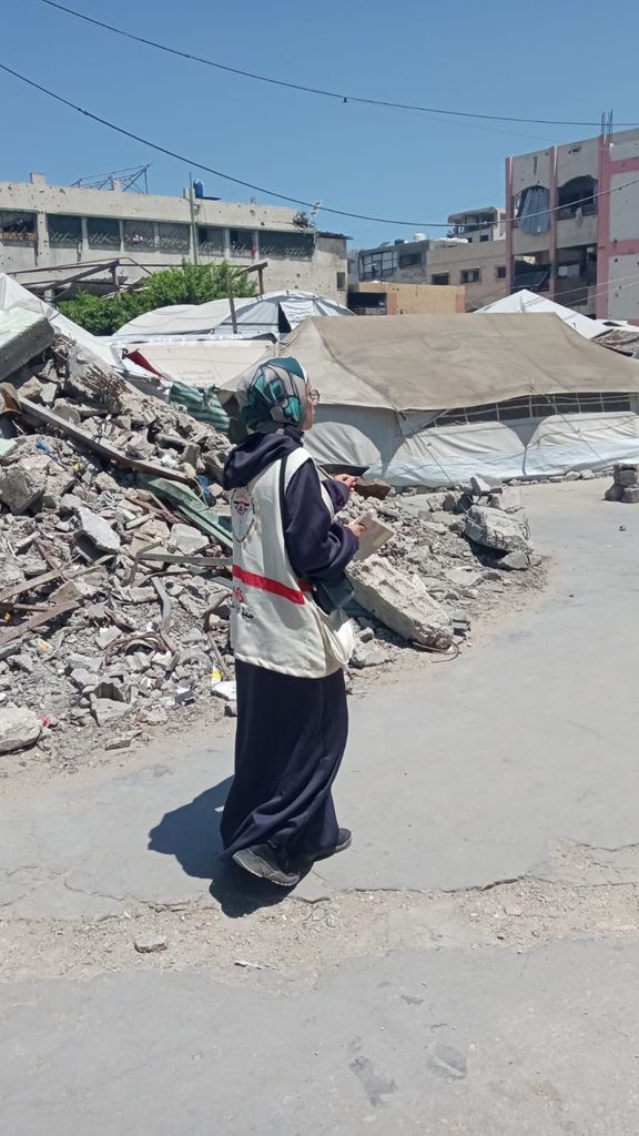 Weam revêt son gilet blanc, frappé du signe de PMRS – Palestinian Medical Relief Society, le Secours médical palestinien. Elle est, au sein de cette ONG d’accès aux soins, partenaire historique du Secours populaire dans les territoires palestiniens, l’une des 60 sage-femmes réparties sur la bande de Gaza. Chaque jour, elle rend visite aux femmes enceintes et aux toutes jeunes mamans là où elles se réfugient – dans les abris et les camps, parfois les restes de leurs maisons. Elle s’entretient avec les femmes de planification familiale et les adolescentes des transformations à l’œuvre dans leur corps. Elle soigne les maladies gynécologiques qui se multiplient en raison du manque d’eau potable et d’hygiène, écoute et conseille ; rassure aussi. « Je les soutiens avec des mots doux. » La famine, qui progresse comme une ombre sur Gaza, provoque chez les femmes enceintes anémies ou fausses couches – « elles n’ont plus la force de soutenir leur propre ventre » –, chez les nourrissons retards de croissance. Pour la plupart des familles gazaouies, le seul repas de la journée est une assiette puisée à la « tekyia », la soupe populaire. La peur continuelle des bombardements provoque chez les femmes de Gaza un stress immense et une avalanche de dépressions post-partum. Malgré ces conditions extrêmes et la pénurie de médicaments, son « désir de porter assistance est intact » et son métier continue d’être « une source de bonheur ». Sa seule, et ténue, source de bonheur.