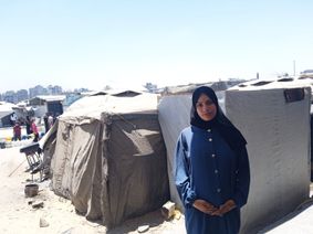 Je m’appelle Dina Al-Nahhal, j’ai 21 ans. J’ai donné naissance à une petite fille il y a 2 ans, juste avant la guerre et j’attends mon deuxième enfant ; je suis à sept mois de grossesse. Mon mari et moi étions propriétaires de notre maison mais elle a été bombardée et maintenant nous habitons sous une tente dans le camp de Sheikh-Radwan, dans la ville de Gaza. Les conditions de vie dans les tentes sont très dures. Cette nuit, à 1h30, nous avons été bombardés. Je suis épuisée. Il n’y a, dans les tentes du camp, ni cuisine ni salle de bain. Aucune possibilité d’avoir un peu d’intimité. Nous avons cette seule tente et elle contient toutes nos possessions – elle contient toute notre vie.