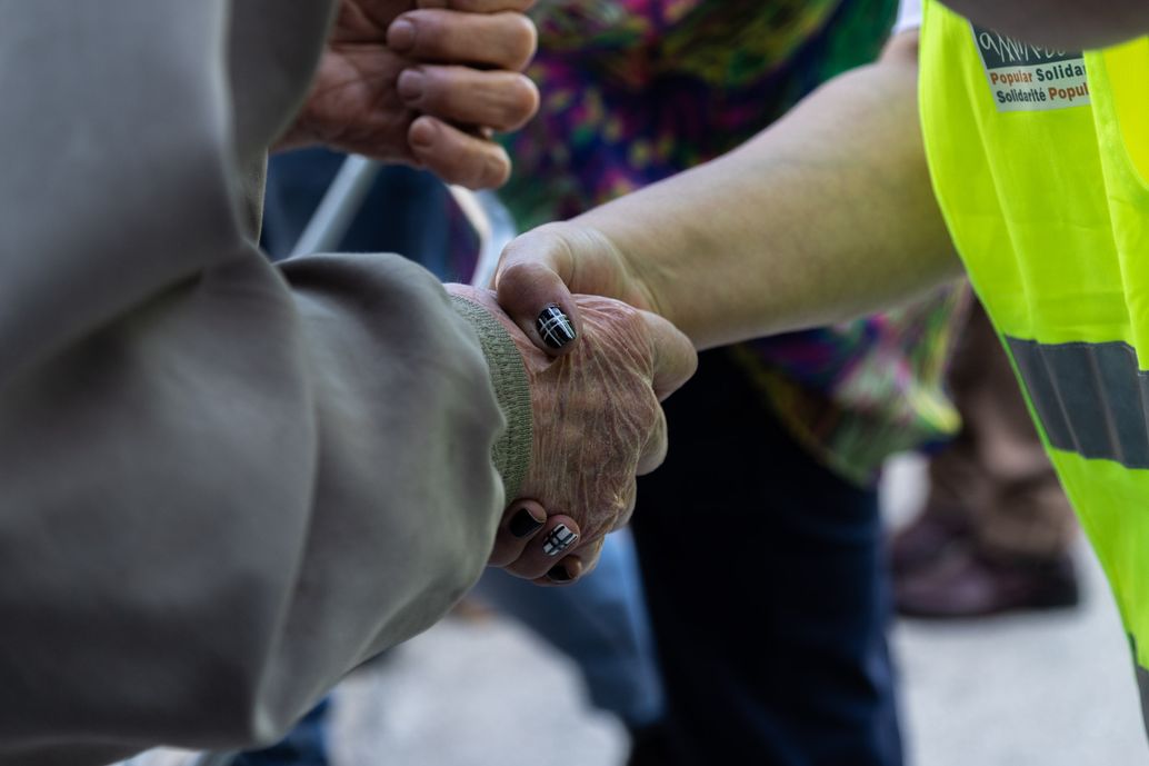 L’équipe de SPG se retrouve dans le quartier de Kypséli Grava, « l’un des quartiers les plus populaires d’Athènes, précise Haïk. Y vivent de nombreuses personnes au chômage, des immigrés de première et deuxième générations, beaucoup de personnes âgées. C’est un quartier où la pauvreté frappe dur. » Sur une place entourée d’un complexe scolaire et d’un centre socioculturel, Haïk, Xénophon et Anastasia sont rejoints par Katerina, Rena, Helena et Christina et tous revêtent leur chasuble jaune vif. À l’ombre de petits oliviers, des personnes attendent déjà, tenant l’invitation qu’ils ont reçue de SPG. « L’association Solidarité populaire de Grèce, pleinement consciente des difficultés auxquelles de nombreuses personnes et familles sont confrontées, vous invite à accepter un sac de nourriture », peut-on y lire, entre autres lignes délicates. Une heure et demie durant, des hommes et des femmes, de jeunes mères de famille, mais surtout des personnes âgées, repartiront munis d’un sac de vivres ainsi que d’un litre d’huile de tournesol.