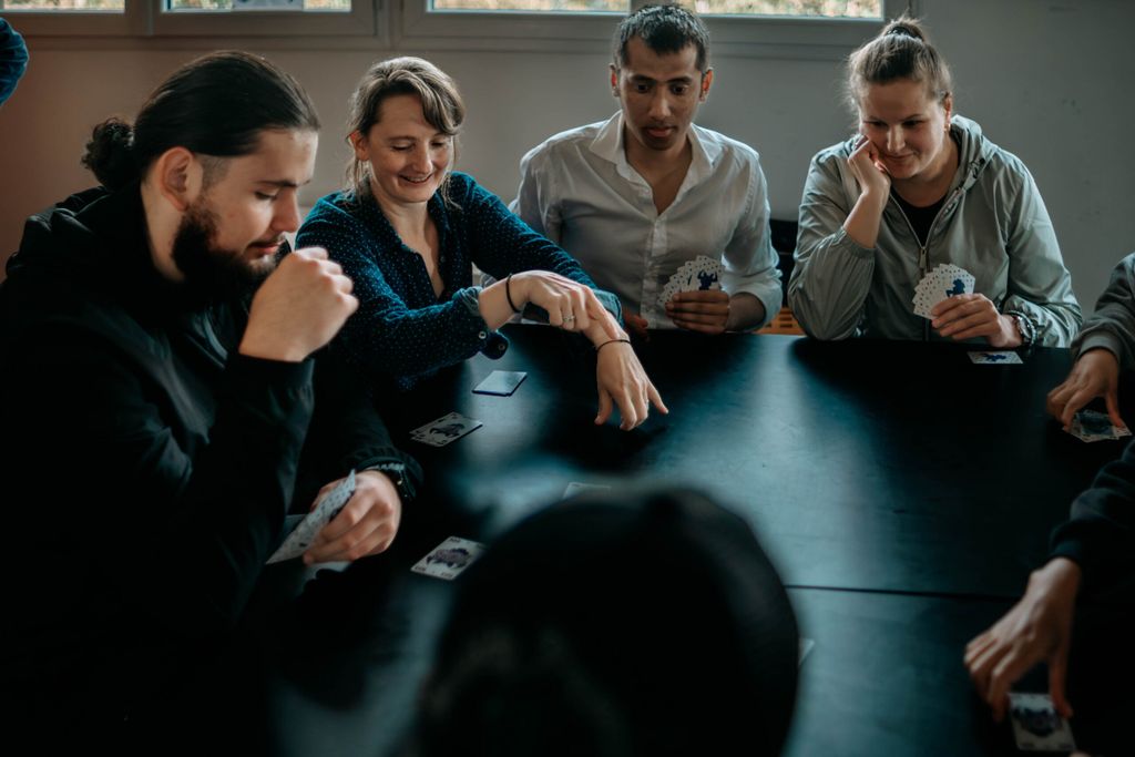 Nelly répartit à présent les participants en deux tablées. La première entame une partie de Skyjo, autre jeu de cartes trépidant. La seconde, réduite à cinq joueurs, déploie un jeu de plateau, le Tsuro, le « jeu des chemins ». Leurs gestes ralentis, leur déplacement cérémonial des pions, leurs échanges à voix basse contrastent avec les rires des joueurs de carte qui éclatent à l’autre bout de la salle. En même temps qu’ils construisent leurs chemins, ils échangent en français, la langue qui les lie – Mansour, qui vient de l’ouest-Soudan, parle four ; la langue de Sam et Dost Mohamed est le dari ; celle de l’Ivoirien Abdoulaye le mahou ; Sangmo parle quant à elle le tibétain de Lhasa. Ensemble, en même temps qu’ils progressent dans la construction de leurs chemins sur le plateau, ils travaillent cette langue qu’ils aspirent à parler toujours mieux. Ce qu’ils ont appris plus tôt, lors des cours de français, ils l’appliquent à présent, dans le pur plaisir de la rencontre et du partage. L’atelier terminé, chacun vient saluer Nelly. « Au revoir » ici. « A bientôt » là. « A la prochaine », lance quant à lui Sam. Anna s’approche de Nelly : « Merci ».