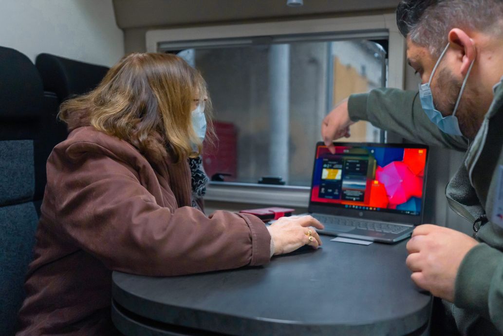 De l’autre côté de la rue, Laurence, 62 ans, ouvre la fenêtre du rez-de-chaussée pour saluer Christophe : « Je promène mon chien et j’arrive avec mon dossier », lance-t-elle, tout sourire, alors qu’un moteur diesel un peu poussif passe. Mais, c’est d’abord Chantal qui monte dans la permanence mobile. Elle s’assoit sur la banquette aménagée à l’arrière. Christophe a fait pivoter son fauteuil de conducteur et lui fait face, un ordinateur posé sur la table qui le sépare de son premier rendez-vous. La porte a été fermée, c’est un vrai petit cocon.