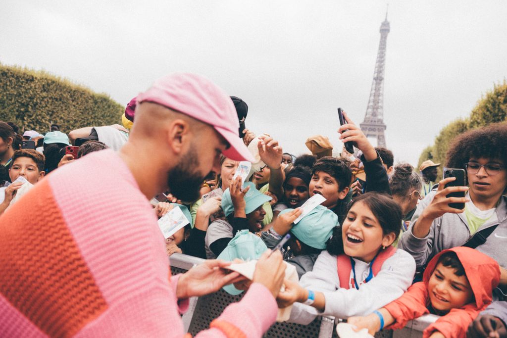 C’est le tour de Carbonne, casquette rose, lunettes aux verres fumés, qui est venu avec ses « frérots musiciens ». Il demande d’emblée « un max de bruit pour le Secours populaire ». La pluie commence à tomber doucement quand le jeune rappeur entame son irrésistible titre « Imagine », qui suscite immédiatement une clameur de joie. « Quitter Paname et changer d’air / On veut changer de vie, changer de météo / Loin des trams et des quais de métro ». Mais c’est sous le ciel de Paname, exactement, que les 40 000 enfants veulent être. La capitale était pour la plupart d’entre eux un rêve, comme Sofia, 10 ans, qui vient du quartier du Mirail à Toulouse. « Je rêvais de voir Paris, de voir la Tour Eiffel, et aujourd’hui je vis mon rêve », sourit-elle. Le rêve partagé des 40 000 enfants se poursuit avec le dernier concert : Bigflo et Oli sont accueillis par une ovation. Trixie, 10 ans, qui est partie de Limoges à l’aube, hurle de joie. Elle connaît leurs chansons par cœur et toute la fatigue de la journée est balayée par le bonheur et l’incrédulité de voir les deux frères « en vrai ». « Merci la famille » sont leurs premiers mots : entre le « Secours pop » et les deux Toulousains, c’est une longue histoire de complicité. Ils demandent, entre deux chansons, aux enfants de lancer leur casquette en l’air : elles créent un arc-en-ciel éphémère dans le ciel mouillé de Paris, préparant la surprise qui s’annonce.