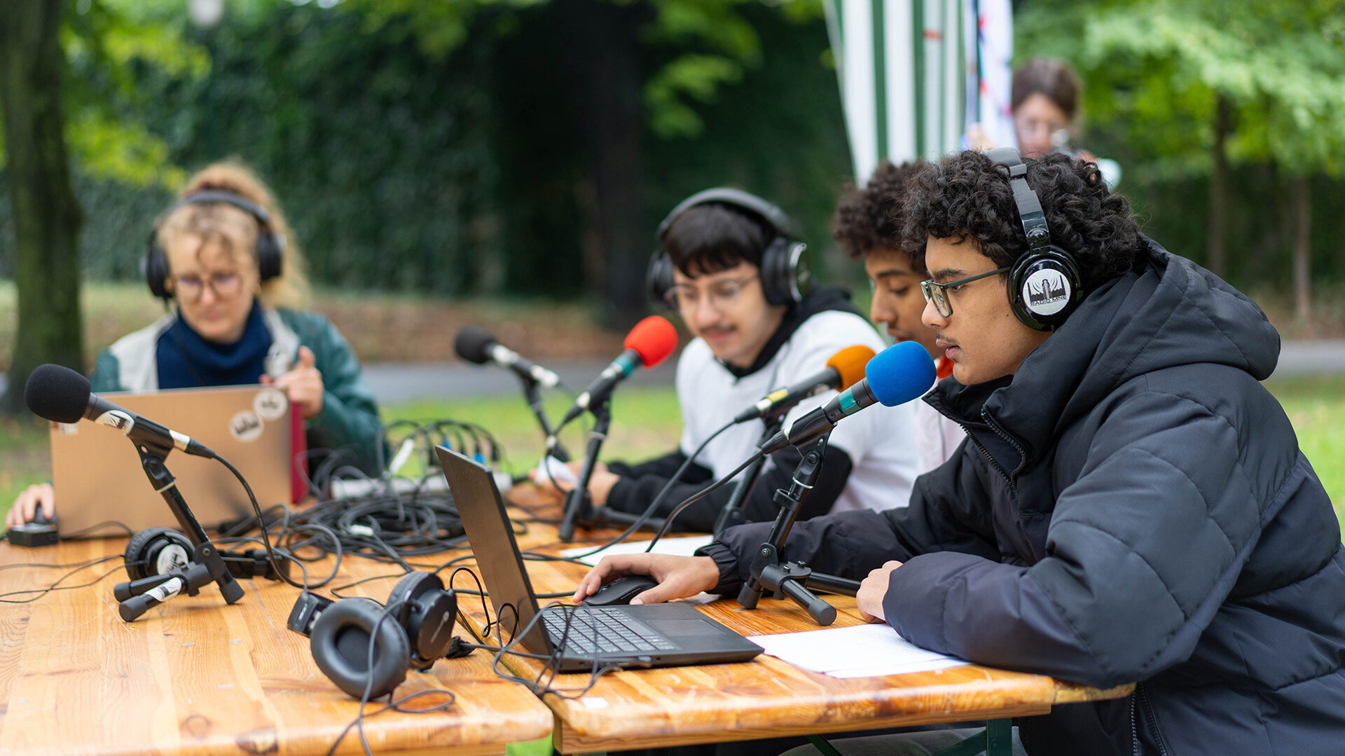 Casques ajustés sur la tête et micros ouverts face à eux, Aymen, Emil et Malek se lancent pour deux heures et demie d’émission. Ils ont entre 15 et 16 ans et invitent gaiement, tour à tour, les habitants à venir à la fête. Arborant chacun le t-shirt blanc de Copain du Monde, les trois ados enchaînent leurs questions avec une énergie communicative incitant leurs invités à présenter les activités du Secours populaire et de Copain du Monde.
