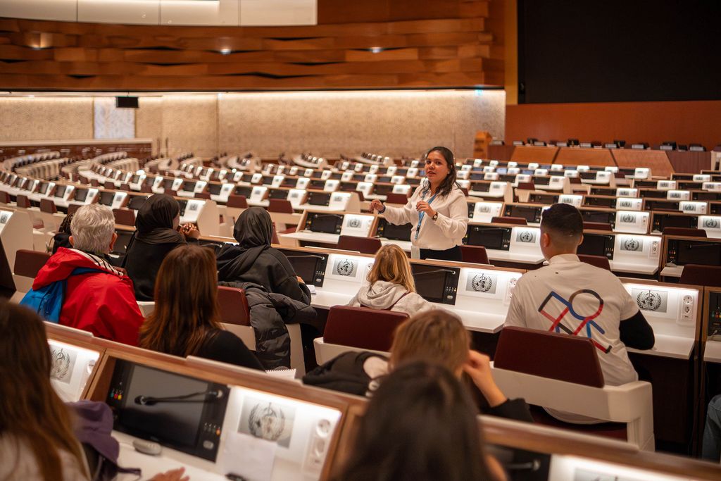 Sans temps mort, les enfants enchaînent avec la visite programmée à 14 h 30 du Palais des Nations, qui se trouve en face du musée. Divisés en deux groupes, ils commencent par découvrir la salle XIX située dans le bâtiment E, l’une des 34 salles de conférences du site, qui est, avec Vienne, le siège de l’ONU en Europe. Maria, guide mexicaine francophone, leur explique le rôle des Nations unies et le déroulement d’une conférence avec ses interprètes qui traduisent en direct les débats depuis des cabines vitrées situées en hauteur de l’auditorium.
