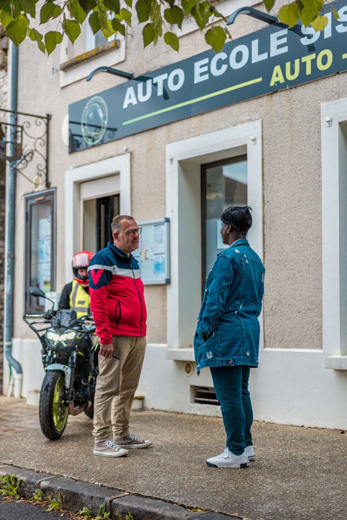 À Moret-sur-Loing, l’auto-école de Stéphane est installée à même le rempart qui marque la limite de la vielle ville, située en Seine-et-Marne, à 80 km de Paris, près de Fontainebleau. C’est aussi loin de la capitale que Beauvais, Compiègne ou Dreux. Passant devant l’auto-école, Lucie – longue veste en jean, petit sac à main beige en bandoulière – aperçoit Stéphane, qui a passé son blouson pour accompagner un motard pour une leçon de conduite.