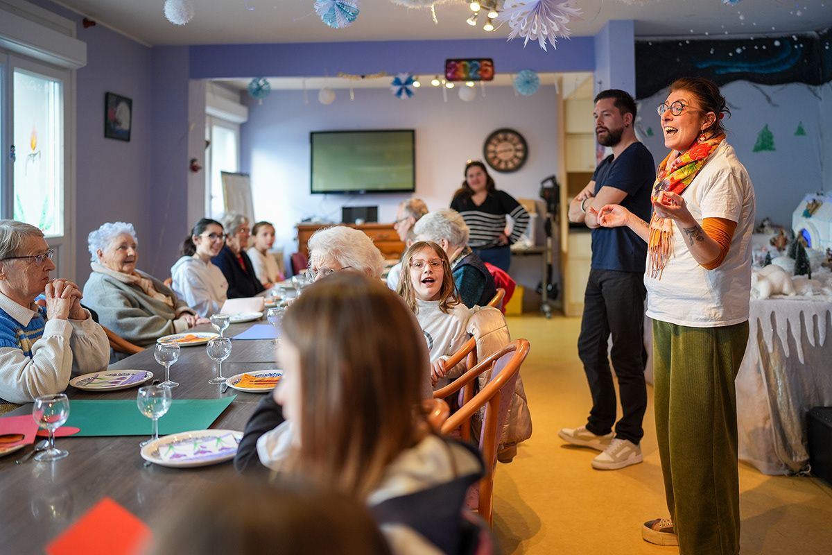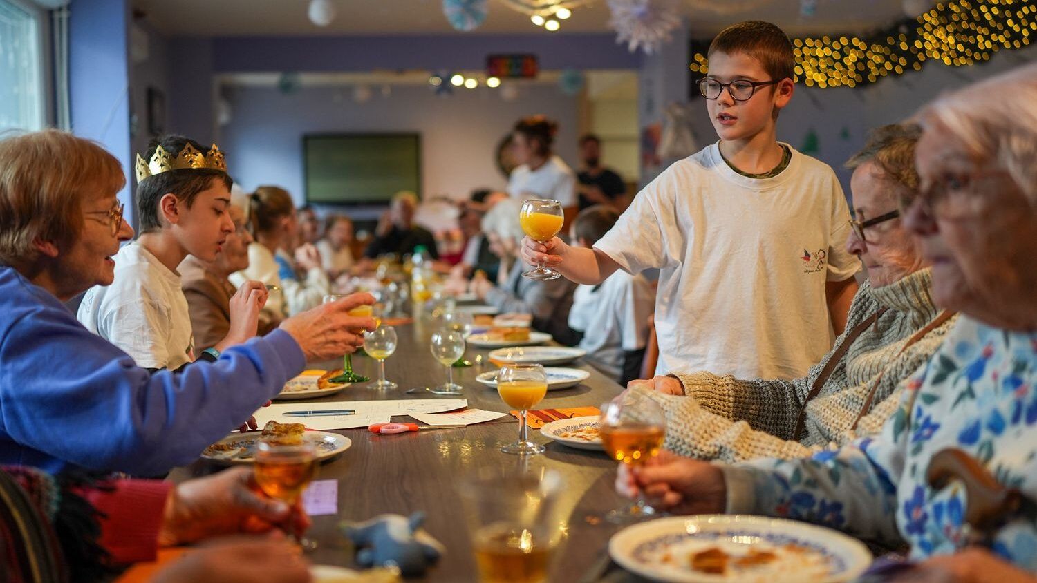 Une image qui résume cette petite bulle de bonheur ? Robert, 65 ans, et Elena, 6 ans, dansent ensemble dans la salle de réception, alors que la sono passe des chansons enjouées qui plaisent à tous les âges. Les deux affichent un grand sourire tandis que 20 paires de mains battent la mesure, autour de la grande table qui a été décorée et sur laquelle trônent des verres de jus et les dernières parts de galettes à la frangipane qui n’ont pas encore été dégustées.