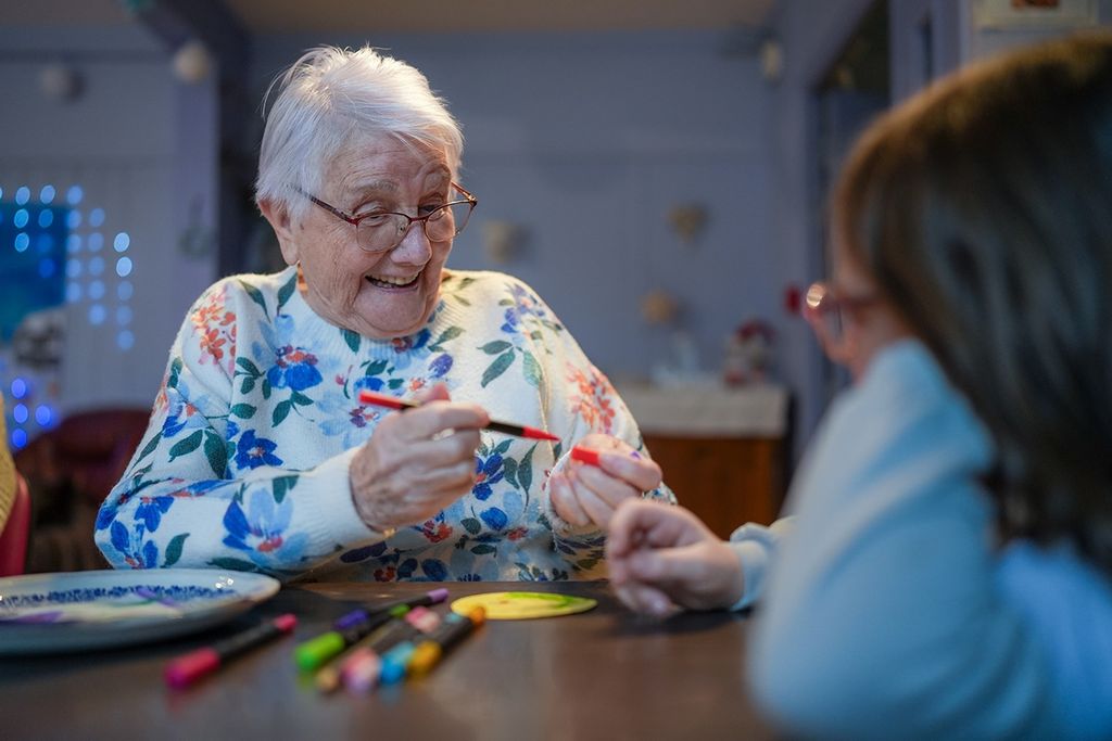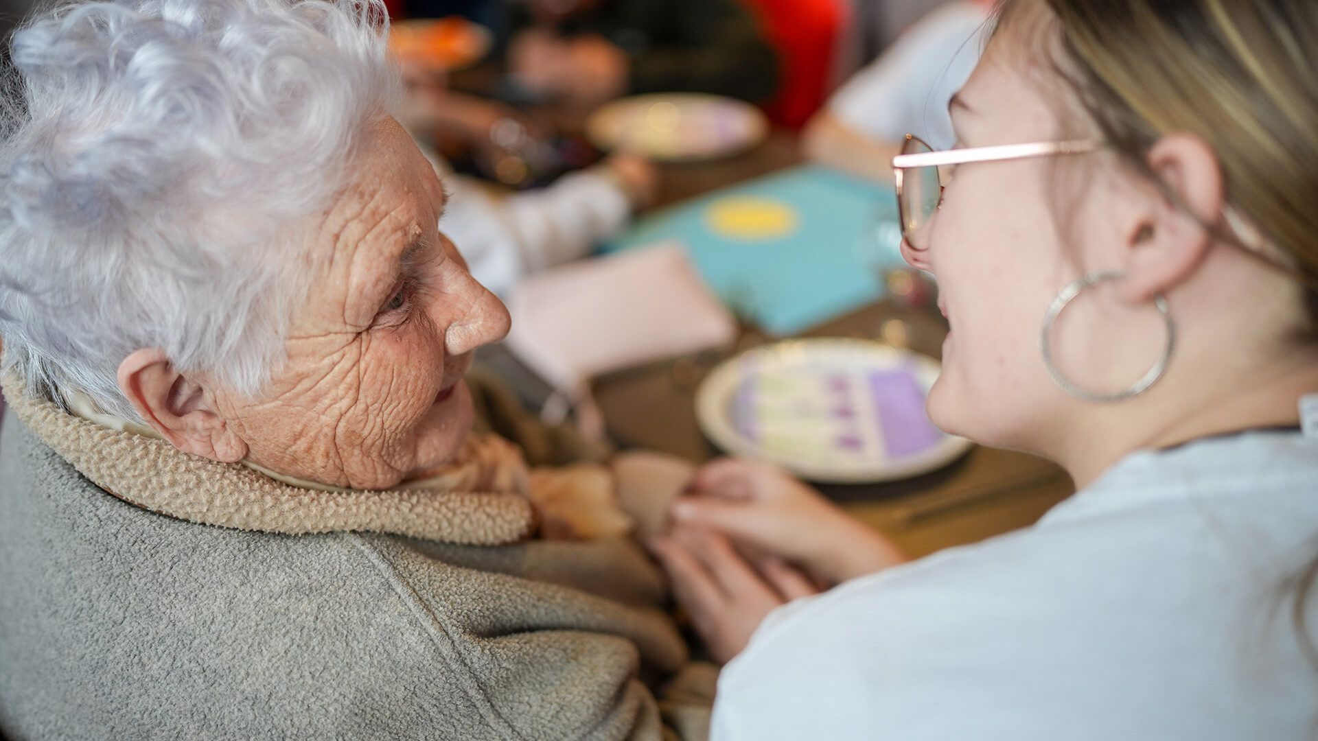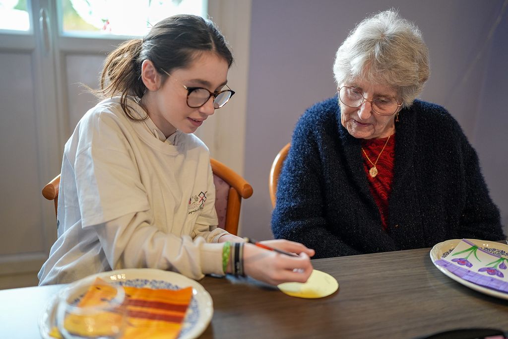 Lola, Lucas, 11 ans, et Mickaëlle découpent des ronds dans des feuilles de couleurs jaune, vert, rouge ou bleu. Chaque enfant fera dessus un dessin avec son grand-parent du jour. Marie vient juste d’arriver, un peu en retard. Elle cale sa canne en bout de table et s’assoit. Tout de suite, la virevoltante Elena s’approche et se présente. Elle est aussi grande debout que Marie assise. La petite fille échange des sourires, puis écarte ses longs cheveux châtains d’un geste de la main et embrasse doucement Marie, qui est “conquise”.
