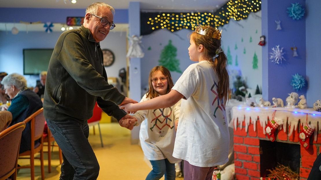 Une image qui résume cette petite bulle de bonheur ? Robert, 65 ans, et Elena, 6 ans, dansent ensemble dans la salle de réception, alors que la sono passe des chansons enjouées qui plaisent à tous les âges. Les deux affichent un grand sourire tandis que 20 paires de mains battent la mesure, autour de la grande table qui a été décorée et sur laquelle trônent des verres de jus et les dernières parts de galettes à la frangipane qui n’ont pas encore été dégustées.