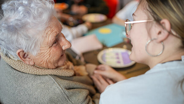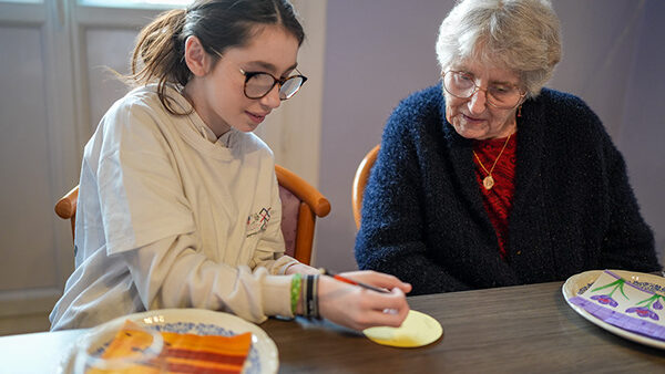 Lola, Lucas, 11 ans, et Mickaëlle découpent des ronds dans des feuilles de couleurs jaune, vert, rouge ou bleu. Chaque enfant fera dessus un dessin avec son grand-parent du jour. Marie vient juste d’arriver, un peu en retard. Elle cale sa canne en bout de table et s’assoit. Tout de suite, la virevoltante Elena s’approche et se présente. Elle est aussi grande debout que Marie assise. La petite fille échange des sourires, puis écarte ses longs cheveux châtains d’un geste de la main et embrasse doucement Marie, qui est “conquise”.