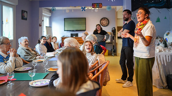 En face, c’est Nassim qui fait l’émerveillement de Jeanne. À 13 ans, il a un côté surdoué et aime bien partager ses passions : il a dessiné un navire marchand en quelques traits suggestifs et raconte à sa voisine son amour des bateaux. « Il est formidable, lance Jeanne. Je suis épatée de rencontrer de petits bénévoles comme ça. » Elle lui parle de ses petits-enfants et de sa propre expérience de bénévole : plus jeune, elle aussi venait voir les personnes âgées. C’est l’heure des galettes. Tout le monde se régale. Alicia, qui a un t-shirt rayé, a trouvé une fève dans son assiette. Elle la montre à Mickaëlle, qui a distribué délicatement toutes les parts découpées par Nicolas : « “Jazz”, oh, elle est très belle. Tu sais que je suis chanteuse ? » demande-t-elle à Alicia. Après une petite discussion, Alicia se lève et va danser avec Elena et Robert, la mascotte de la résidence.