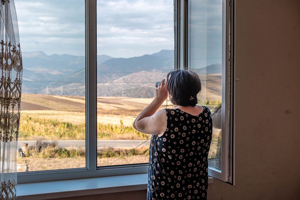 Le regard de Nona part à nouveau se perdre dans les paysages montagneux et arborés que sa fenêtre encadre. Dans les plis de ceux-ci repose son passé. « De ma fenêtre, je vois mon pays. Plus que de la souffrance, j’en tire du soulagement, analyse Nona. Notre maison est la plus proche de la route qui mène au Haut-Karabagh. Quand nous pourrons retourner chez nous, nous serons la première famille à retourner à la maison ! », dit-elle d’un ton soudain plus léger, et tout le monde rit autour de la table. L’attachement indéfectible de Nona et sa famille à leur terre natale, leur espoir inaltéré de pouvoir y retourner un jour soulèvent en Ruzana une vague immense de tendresse et d’admiration. « Leur force, leur dignité et leur détermination à reconstruire leur vie en Arménie tout en restant fermement attachés à leurs racines sont profondément émouvantes et inspirantes », songe-t-elle. L’après-midi touche à sa fin, la nuit tombera bientôt. Nona sort du meuble une paire de jumelles. « Avant la tombée de la nuit, je me poste à la fenêtre avec mes jumelles, anticipe-t-elle. Je regarde les maisons vides et, chaque soir, je vois deux soldats qui allument les lumières des maisons et celles de la route. Ils veulent faire croire que c’est habité, que les Azéris se sont installés mais je le sais, moi, qu’il n’y a personne. » Nona sourit. Derrière elle, une affiche du Haut-Karabagh, l’unique décoration qui orne les murs nus de son salon, accroche la lumière du soir. « C’est chez nous. »