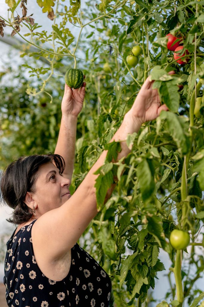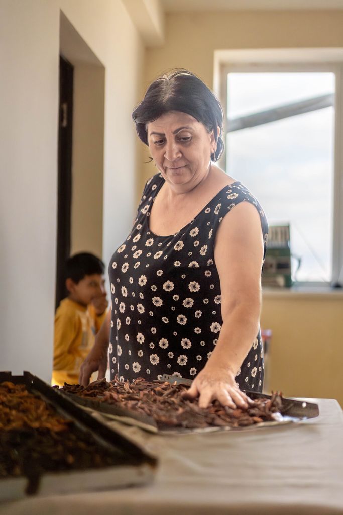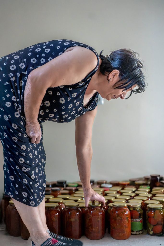 Les deux femmes s’embrassent, échangent quelques nouvelles et Ruzana glisse dans la main de Nona un sac empli de produits d’hygiène et de couches pour son petit-fils. Dans les yeux de Nona passent, fugaces, soulagement et gratitude, teintés d’un fond de désespoir. Kamo, son époux, émerge de la serre, les mains emplies de tomates, qu’il offre en retour. La serre que l’homme a construite abrite une forêt luxuriante de fruits et légumes qui font leur fierté – les tomates y côtoient pastèques immenses et rangs fournis de haricots. Les graines de haricots blancs sont la seule chose que Nona et Kamo, lors de l’exil, ont pu apporter de Stepanakert, où ils sont nés, ont grandi et vécu. Kamo dit : « J’ai voulu emmener la terre » – il ne dit pas « graines », il dit bien « terre ». Il se dirige ensuite vers le potager qui borde le pignon. Il plonge sa main profondément dans le sol. « J’ai installé ce jardin ici », explique Kamo, « car c’est ici que la terre est la plus fertile. C’est la même terre noire que dans notre pays, la meilleure terre du monde ». Nona fait signe de la suivre à l’intérieur de la maison, dans la salle de séjour où le café est déjà servi. La maison est vaste mais seules quelques pièces sont investies par le couple ainsi qu’un de leur fils, sa femme et ses trois enfants. Les pièces inoccupées servent à stocker les conserves de légumes, les bocaux de saumure ou à faire sécher les champignons.