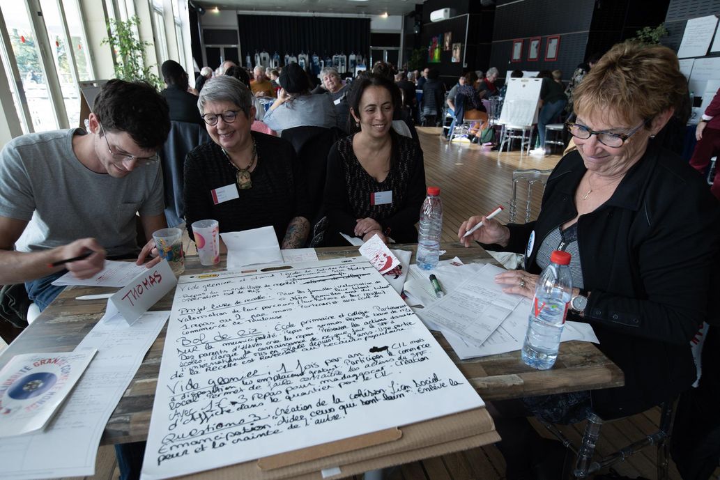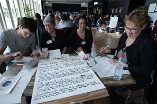 C’est en ateliers, que dès le lendemain les congressistes ont pu débattre et réfléchir sur différentes thématiques liées à la construction d’une solidarité grande comme le monde, ici-et-là bas. En petits groupes, avec des partenaires étrangers, des copains du Monde, les délégués ont réfléchi ensemble à la manière dont chacun, à son échelle peut agir concrètement pour mondialiser la solidarité. Pierre Lacroix, bénévole au comité de Tournon partage avec son groupe son expérience avec les enfants copains du Monde qui après leur rencontre avec des enfants Burkinabé cet été au village copain du Monde de Meyras (Ardèche) se sont mobilisés pour que 40 enfants puissent aller à l’école. Dans une autre salle, un groupe discute du projet « Buffet du Monde » mis en place par le comité de Colomiers (Haute Garonne). Une idée simple, des plats du monde réalisés par des bénévoles de différents pays et proposés à la vente pour financer des projets solidaires. Dans ces ateliers, il est aussi beaucoup question de la place qui doit être donnée aux personnes migrantes et étrangères.