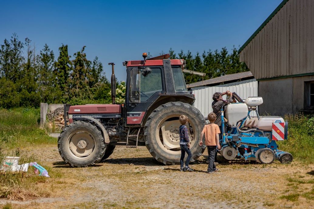 Dans la cour, Jacques a garé le tracteur pour enlever de l’ensileuse, à grands coups d’air comprimé, les derniers grains de maïs, rendus rouges à cause de l’enrobage de pesticides. À chaque jet d’air, un nuage entoure son buste et son visage, les particules rouges s’élèvent et englobent, petit à petit, tout l’arrière du tracteur et de la semeuse. « Les enfants, ne restez pas là. Allez jouer plus loin », leur dit leur père, tout en maniant le tuyau d’air comprimé, qui court derrière lui jusqu’à la stabulation, où le compresseur est abrité. Le bâtiment sert de remise à la moissonneuse et aux autres véhicules agricoles. Mais il n’y a plus de vaches. « Le litre de lait était tombé à 15 centimes, ça ne couvrait pas les frais d’exploitation », grince l’agriculteur.