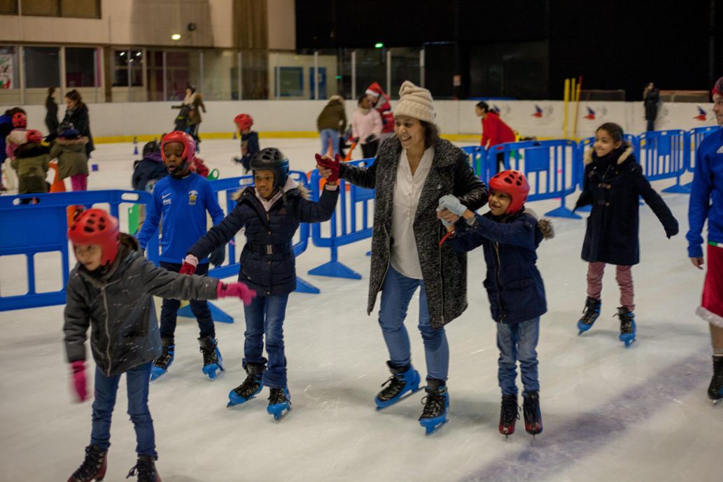 Après ces émotions fortes, les enfants sont divisés en deux groupes. Le premier va sur la glace, aidé par la troupe de patineurs confirmés qui a fait le spectacle. Les rires s’enchaînent, parfois les petites chutes. Rien de grave.