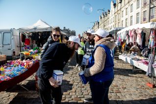 « Ah, j’apprécie quand il y a un échange, que je peux expliquer les activités du Secours populaire. » Cheveux châtains et cigarette roulée à la main, Luc arbore un grand sourire. Il participe, au matin du samedi 13 avril, à une grande collecte organisée par les jeunes bénévoles du Secours populaire à Arras (Pas-de-Calais). C’est l’heure du marché et le soleil est très présent pour un mois d’avril, il y a foule sur la place des Héros, qui est bordée par un ensemble de maisons aux façades Renaissance typique des Flandres.