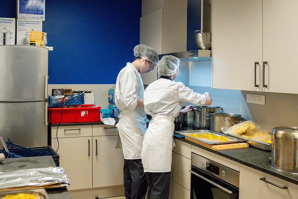 Pour Medhi et Sookalina, apprentis cuisiniers, participer à cette opération est un vrai plaisir. « Nous avons le sentiment d’être utiles aux autres, et que notre savoir-faire est mis au service de personnes engagées et solidaires. Nous avons déjà fait une action du même genre cet hiver en faisant 100 repas chauds pour des sans-abri de la ville. » Sur chaque table, les invités peuvent découvrir le menu qu’ils vont déguster, potage Saint-Germain, saucisson en brioche, ravioles d’escargots, crevettes grillées à l’antillaise, brochettes de volaille façon Gaston Gérard, magret de canard au cassis, fondant au chocolat, brochettes de fruits, crêpes et mignardises. Véronique et Paulette sont un peu effrayées par la quantité de plats, mais Bastien, élève de cuisine installé à leur table, les rassure : « Il y a beaucoup de plats mais les assiettes ne sont pas très remplies. » Car une des règles de ce repas c’est aussi l’échange et le partage, ainsi à chaque table, viennent s’asseoir des bénévoles et un futur chef.