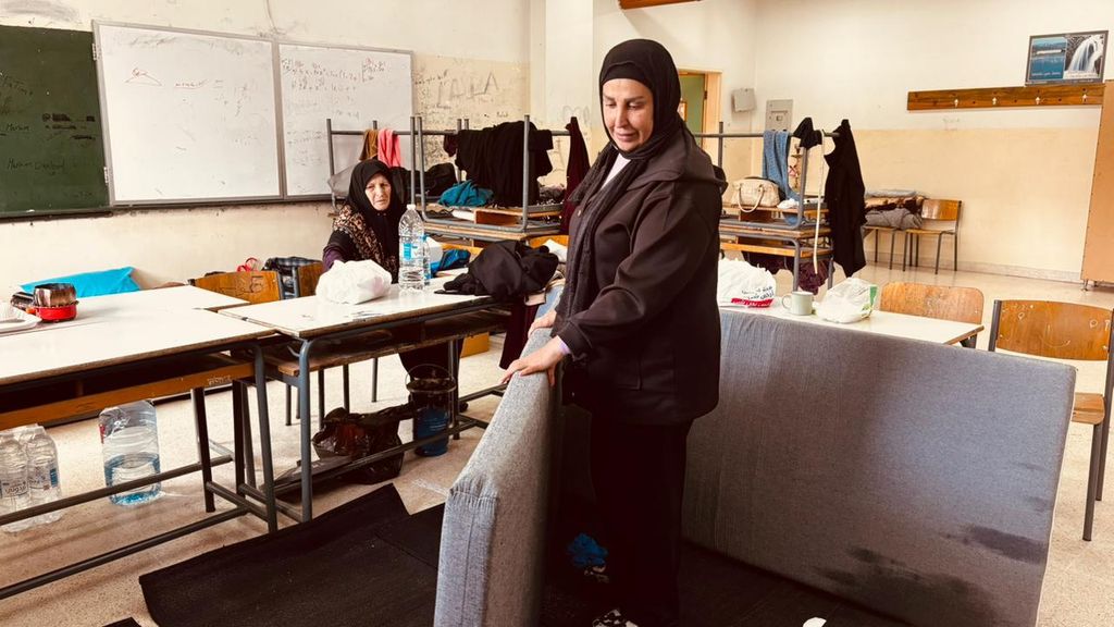 Je passe à présent mes journées dans cette école. Le matin, au réveil, nous descendons dans la cour de récréation et nous partageons une tasse de Nescafé avec les autres personnes qui sont venues trouver refuge ici. Nous nous asseyons, nous parlons, nous partageons nos problèmes, nous nous écoutons les uns les autres. Je pense souvent à mes trois filles – elles sont 25, 30 et 32 ans – qui ont été déplacées à Beyrouth. Elles sont épuisées et sont très inquiètes pour leurs enfants. C’est une situation vraiment triste. Je leur ai dit de nous rejoindre dans cette école, si les choses ne s’arrangent pas. Je leur ai envoyé des photos d’ici, pour leur montrer qu’on y est bien.