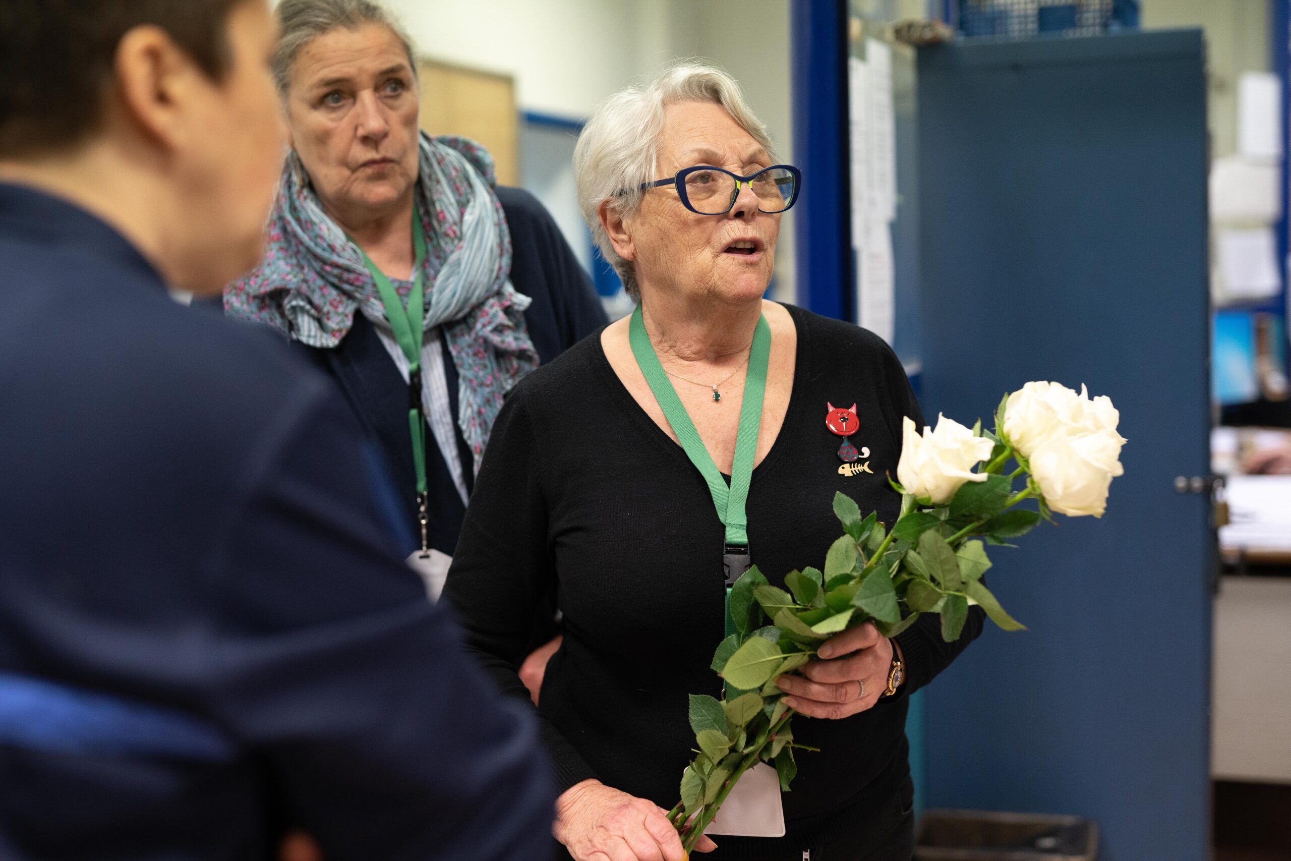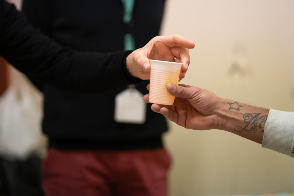 À 10 h 05, un énorme grondement s’échappe de la coursive qui dessert les cellules des personnes condamnées en attente de transfert et celles dont les peines ou reliquats de peine sont inférieurs à deux ans. Tout le monde se fige et se retourne vers le responsable de ce vacarme sourd : quatre poubelles encastrées poussées vers la sortie. En comparaison, les grincements incessants des grilles métalliques bleu pétrole qui s’ouvrent et se referment avec l’écho d’un buzzer passeraient presque pour un concerto de musique concrète. Dans cette partie distincte de la prison qui ne communique pas avec la division 2, un autre groupe de bénévoles s’est installé dans une petite salle étroite aux murs blancs.