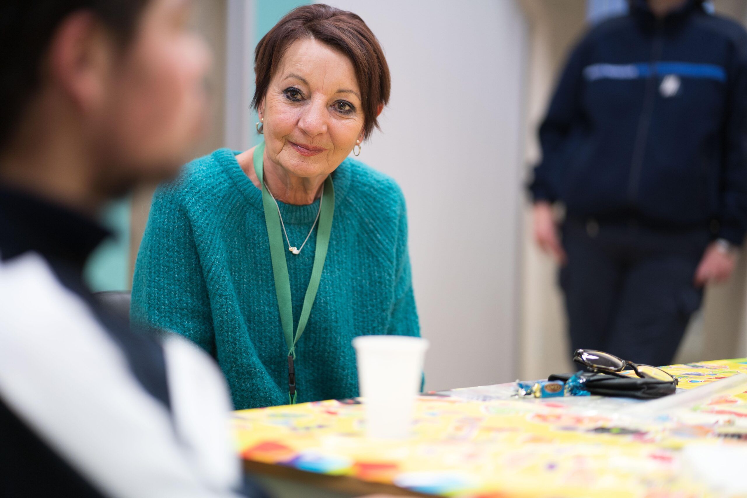 Guidés par Valérie, surveillante qui a suivi l’organisation de cette journée, les bénévoles ont rejoint la division 2 de la prison, qui rassemble les prévenus, pour s’installer dans une salle ornée d’un trompe-l’œil coloré, qui sert occasionnellement de salon de coiffure tenu par un détenu. Derrière une table ornée d’une nappe jaune décorée de bonbons acidulés, trois bénévoles proposent des viennoiseries et une boisson aux personnes incarcérées qui arrivent par petits groupes à 9 h 30. Très vite, le dialogue s’instaure et se focalise sur leurs conditions de détention, leur vie en cellule 22 heures sur 24 hors activités, où ils prennent leur repas, lavent leur vêtement, regardent la télévision louée à leurs frais…