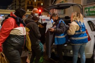 A force de multiplier les maraudes, Janis et Tanya connaissent sûrement tous les sans-abri de la ville. Au 39 rue Vernier, le mercredi, l’équipe de bénévoles prépare les repas qu’elle va distribuer. Ce soir ce sera du poulet, accompagné de riz, du fromage, du pain et un dessert. Une fois tout cela chargé dans la camionnette qui porte la célèbre main portée par des ailes rouge et bleue, l’équipe débute son grand circuit, en ayant pris soin de ne pas oublier boissons chaudes et vêtements d’hiver. « On prend des couvertures, des duvets, des pulls… C’est très demandé à cette période de l’année », indique Ismaan, qui fait ça depuis 6 ans. Place Garibaldi, le soleil est tombé et un vent glacial agresse le visage et les mains. Patrick, la trentaine lui aussi, se tient seul sous les arcades. Aux bénévoles qui s’approchent, il raconte comment le Covid-19 et un divorce l’ont mis à la rue : « J’étais moniteur de ski et couvreur… depuis 18 mois, j’alterne les squats, des amis qui m’hébergent et la rue. » Cette nuit, ce sera la rue. « C’est mon second hiver dehors, c’est dur. »